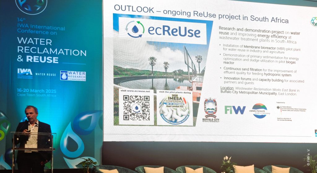 Two members of the FiW team, representing the ecReUse project consortium, participated in the 2025 IWA Water Reuse Conference in Cape Town. During the event, they presented the ecReUse project, highlighting its innovative technologies, including the membrane bioreactor, anaerobic digester, continuous sand filter, and camera-based monitoring system, as well as the project’s objectives for sustainable wastewater management and resource recovery.